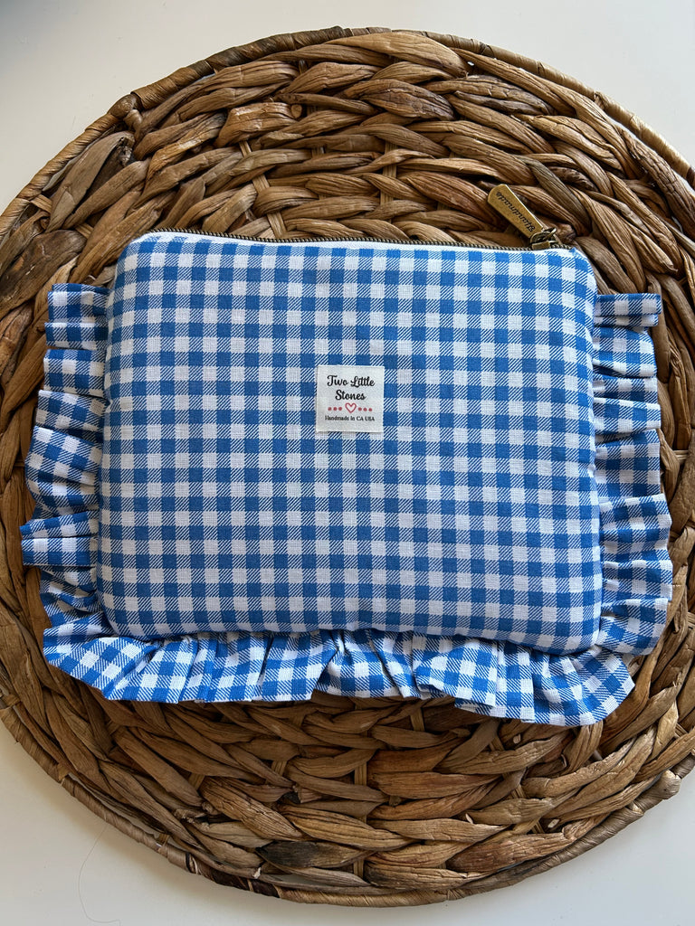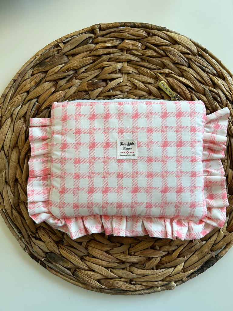 Add a pop of charm to your everyday essentials with this handmade gingham zipper clutch! Designed with a timeless checkered pattern and sweet ruffle trim, this pouch is perfect for keeping your makeup, stationery, tech accessories, or other small items organized in style.